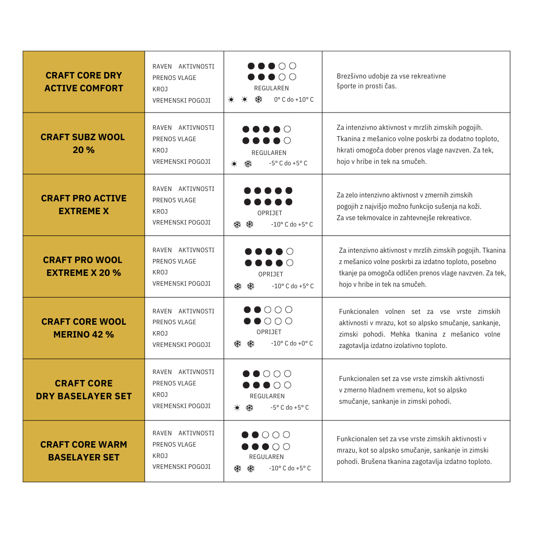 CRAFT ponudba aktivnega perila se deli na tri glavne kategorije. DRY (suho), ki je idealno za intenzivne treninge v toplejših razmerah, WARM (toplo) za hladnejše pogoje in WOOL (volna) za zelo hladne razmere.